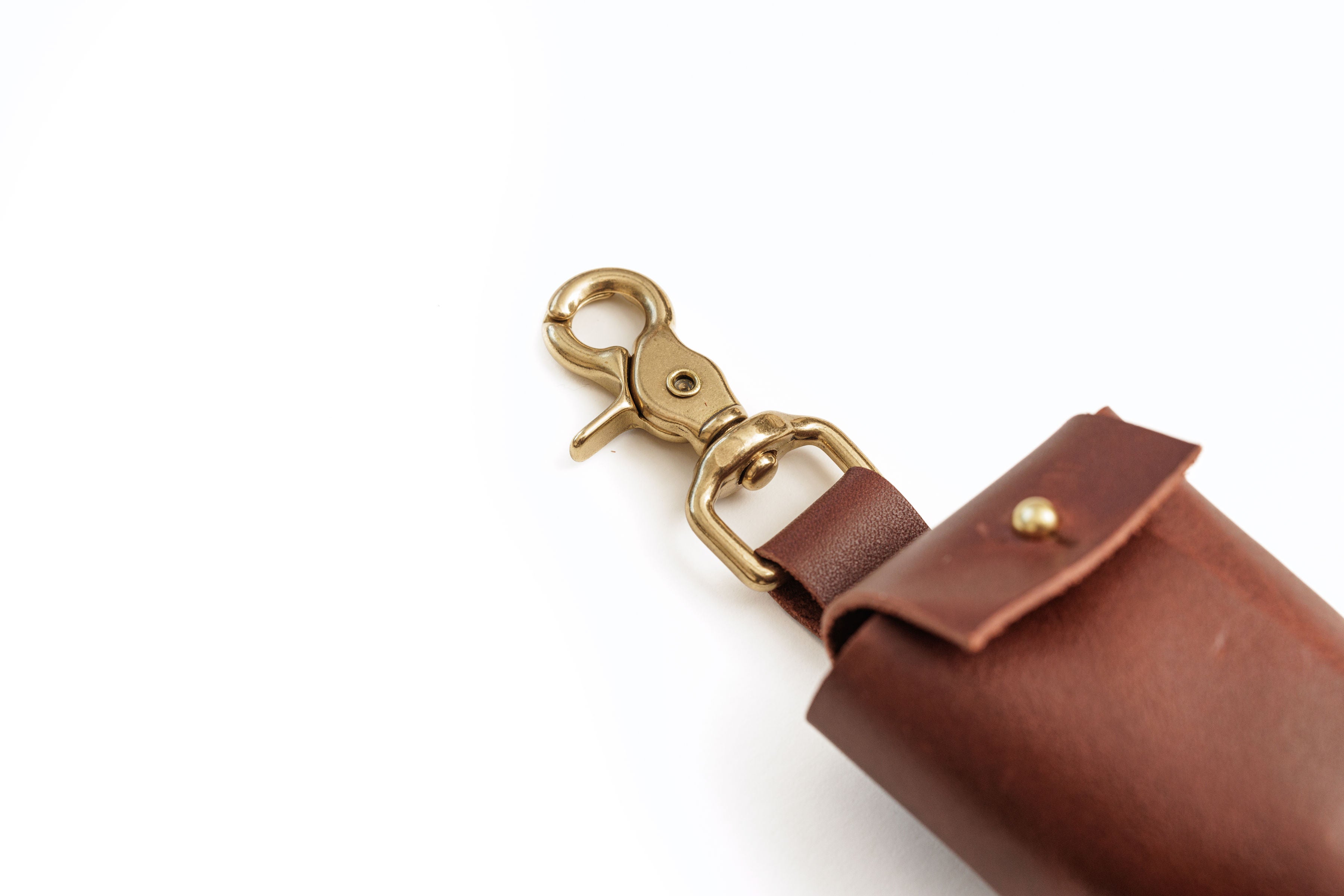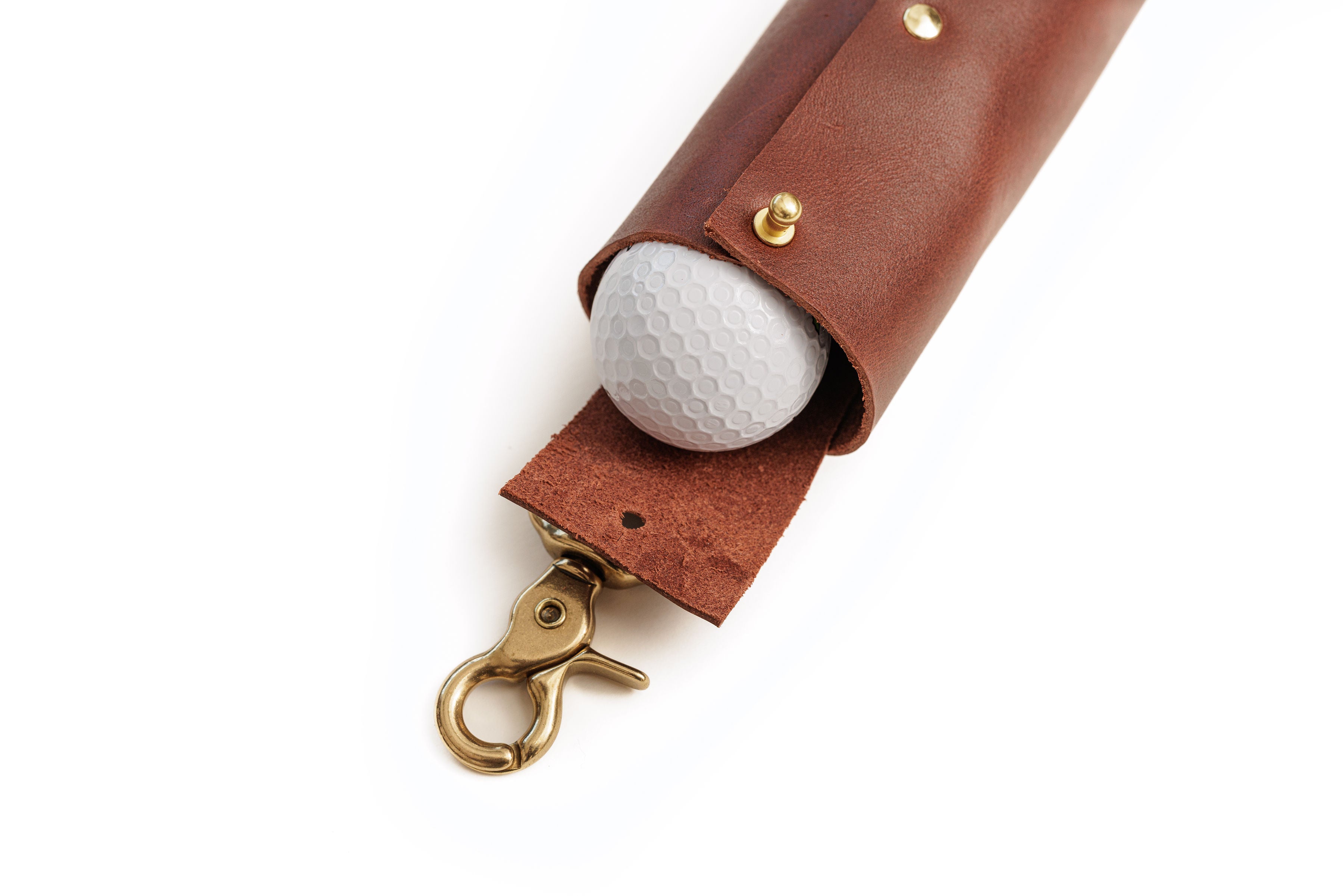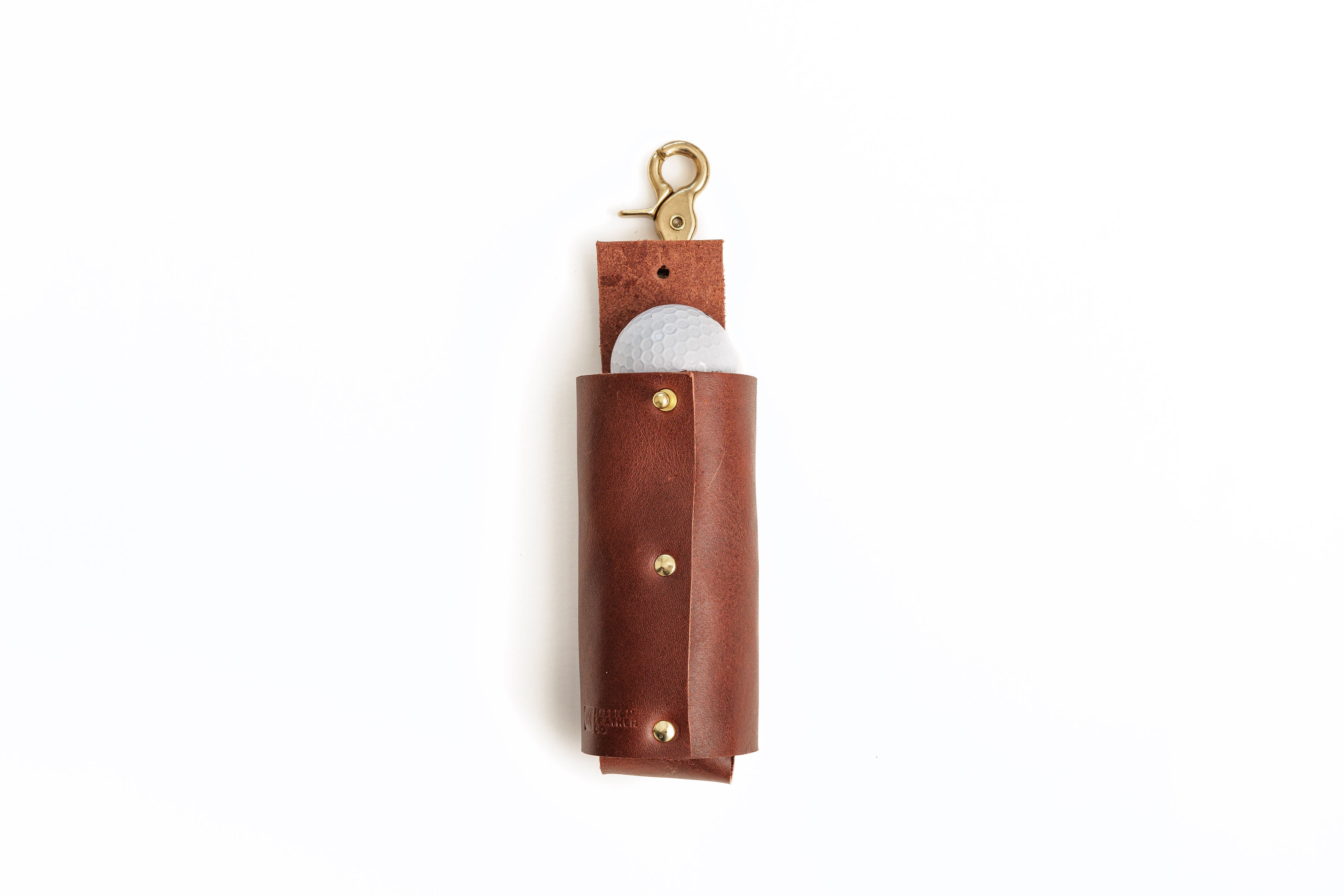 Compact leather golf ball holder designed to keep three balls organized and secure. Hand-stitched construction with solid brass hardware and a reliable clasp that clips easily onto your golf bag or belt. Built to last through countless rounds with premium leather that develops rich character over time.